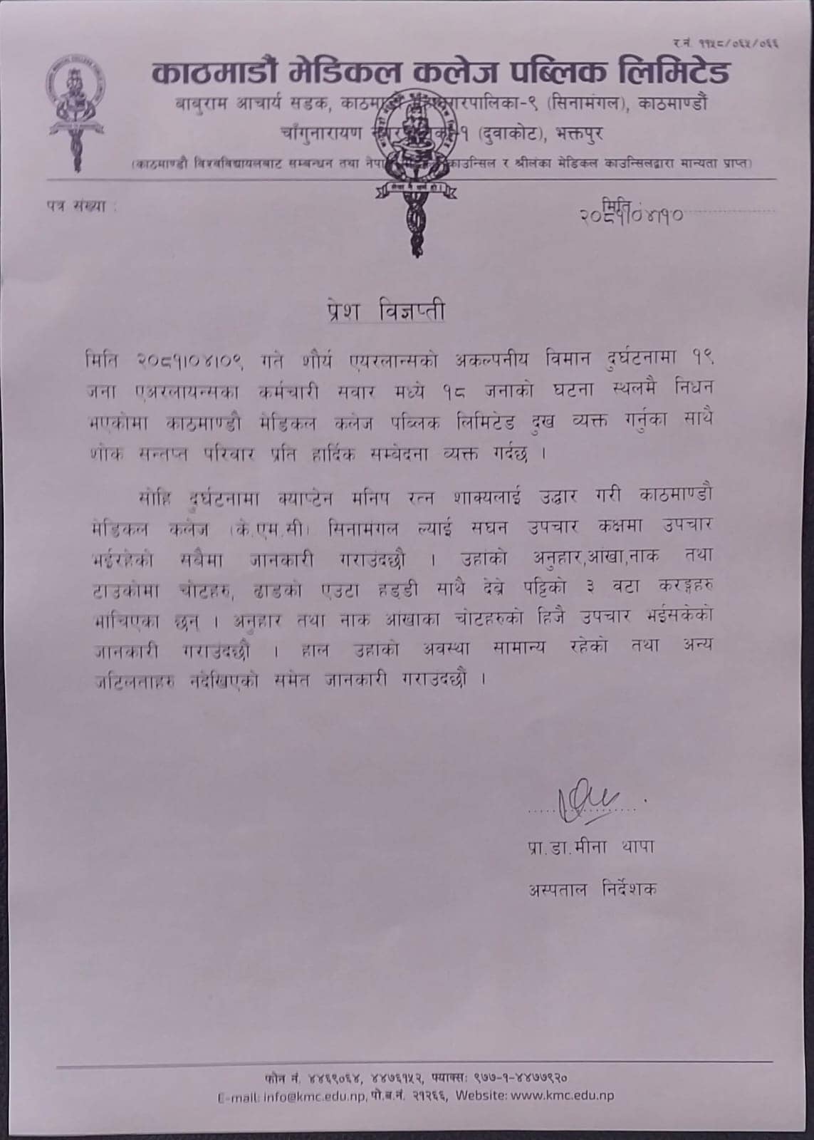 बुधबार त्रिभुवन अन्तर्राष्ट्रिय विमानस्थलस्थित सौर्य एयरलाइन्सको ९–एनए एमई विमान दुर्घटनामा परेका शाक्यको उपचार सिनामंगलस्थित काठमाडौँ मेडिकल कलेजमा भइरहेको हो ।
