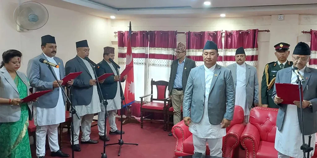 काठमाडौँ । बागमती प्रदेशमा काँग्रेसका ४ जना मन्त्रीले शपथ लिएका छन् । प्रदेश प्रमुख यादवचन्द्र शर्माले आज शनिबार हरि प्रभा खड्गी, सुरजचन्द्र लामिछाने, मिनकृष्ण महर्जन र विमल ठकुरीलाई पद तथा गोपनीयताको शपथ गराएका हुन् ।