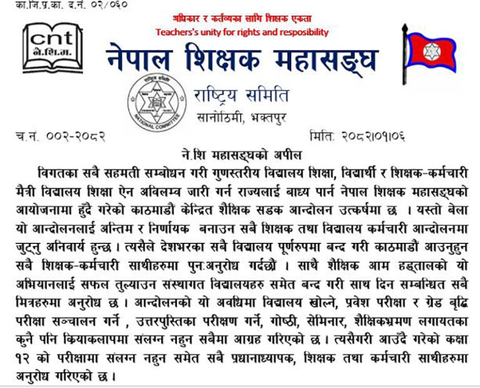 ‘शैक्षिक आम हड्तालको यो अभियानलाई सफल तुल्याउन संस्थागत विद्यालयहरू समेत बन्द गरी साथ दिन सम्बन्धित सबै मित्रहरूमा अनुरोध छ,’ महासंघले जारी गरेको विज्ञप्तिमा भनिएको छ । देशभरका सबै विद्यालय पूर्णरुपमा बन्द गरी काठमाडौँ आउन सबै शिक्षक-कर्मचारीलाई महासंघले आग्रह गरेको छ ।