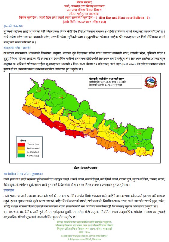 महाशाखाले आगामी दुई दिनसम्म मधेश प्रदेशलगायत बागमती प्रदेश,गण्डकी प्रदेश,लुम्बिनी प्रदेश र सुदूरपश्चिम प्रदेश लगायतका तराईका धेरै स्थानहरूमा अत्याधिक गर्मीको सम्भावना देखिएको जनाएको छ।