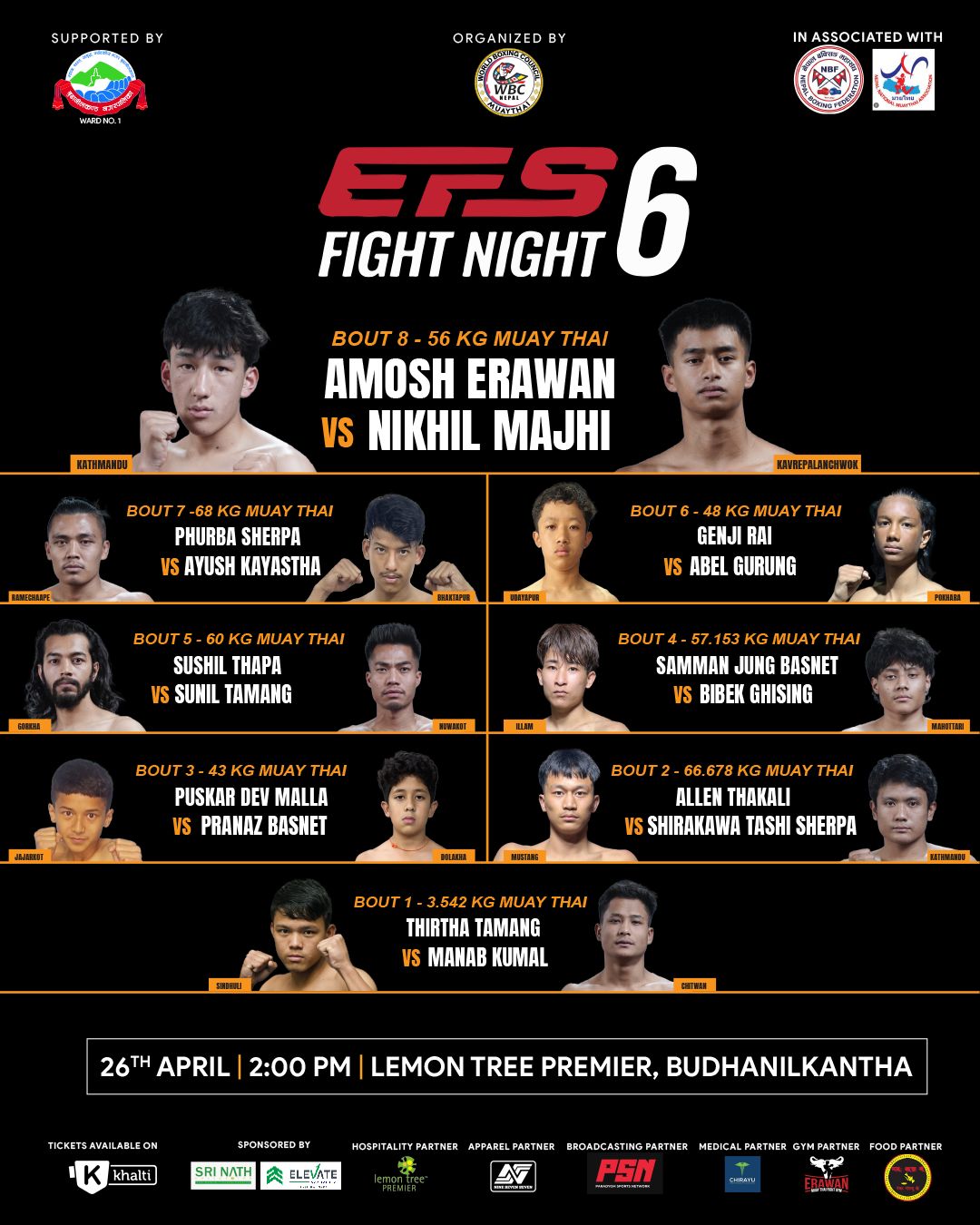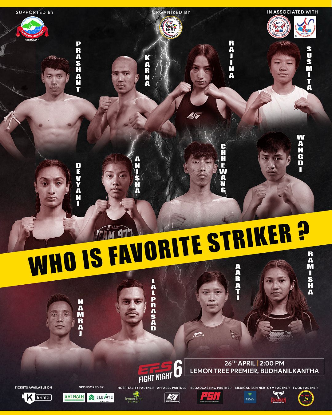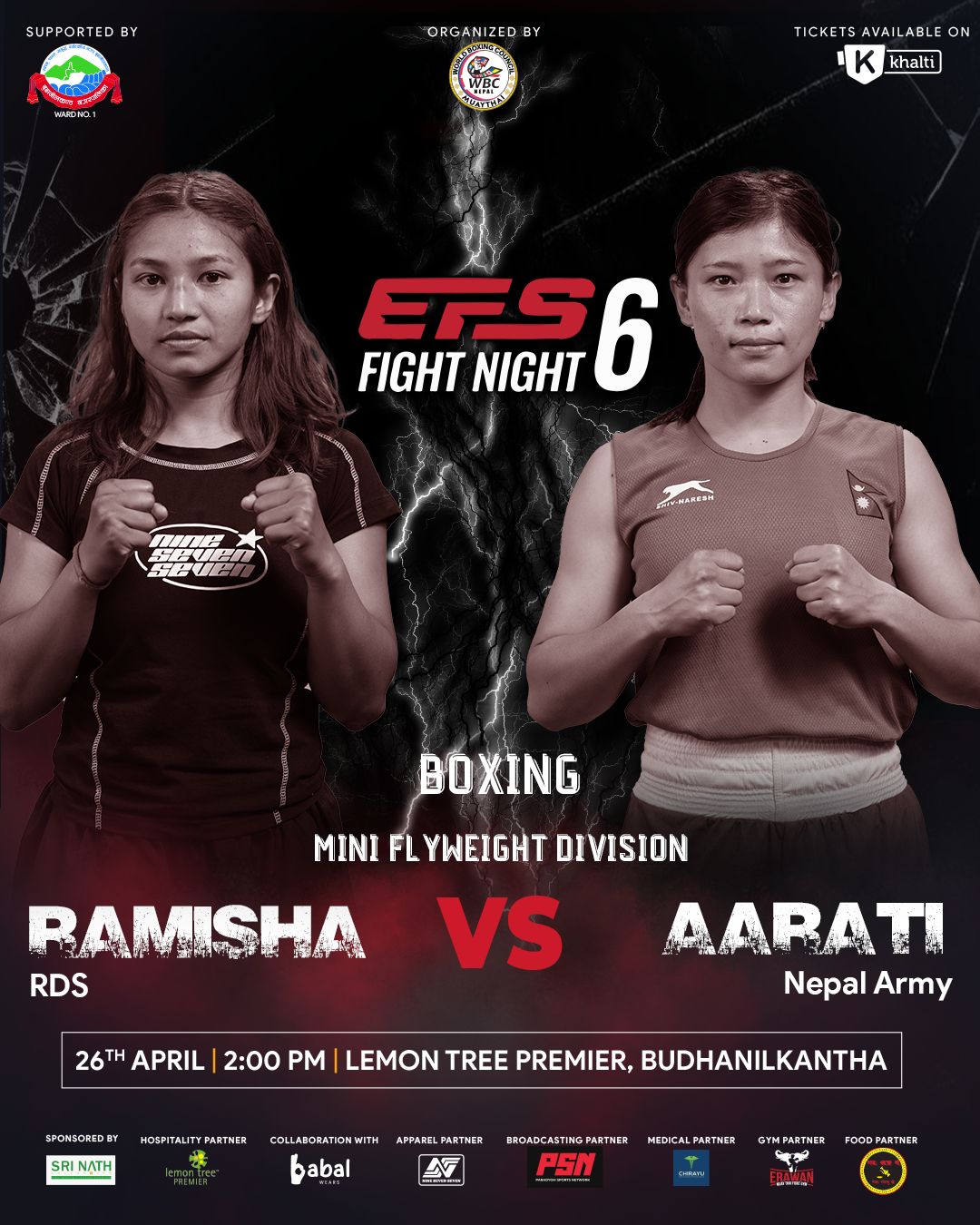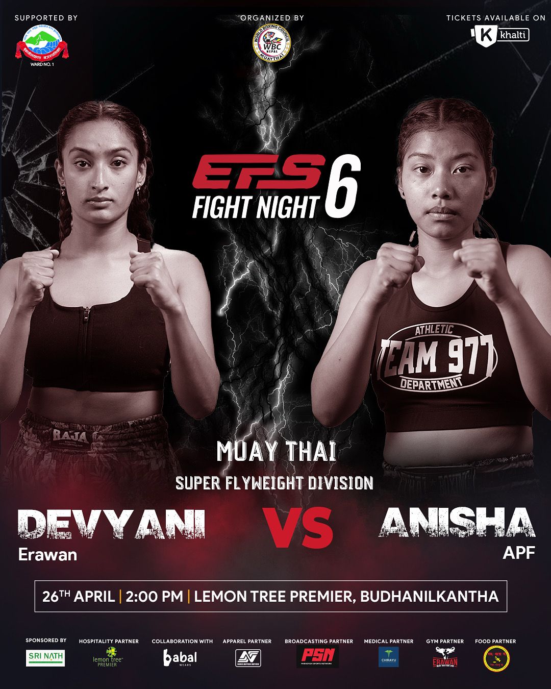 ११ वैशाख,काठमाडौं । महिलाहरुको शसक्तिकरण र बाह्य सुरक्षाको लागि बुढानीलकण्ठ नगरपालिका (बुनपा) वडा नं १ ले वल्र्ड बाँक्सिङ (डब्लुविसी) मुई थाईसँगको सहकार्यमा ‘इएफएस फाइट नाइट सिक्स’ आयोजना गर्ने भएको छ ।