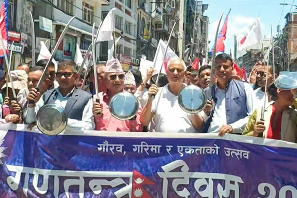 आज काठमाडौँमा गणतन्त्र दिवसलाई उत्सवमय रूपमा मनाउन भन्दै प्रदर्शनमा उत्रिएकाहरूले तरबार र ढालसहित विभिन्न ठाउँबाट प्रदर्शन निकालेको हो । प्रदर्शनमा उत्रिएकाहरूले गणतन्त्र जिन्दाबाद, नेकपा एमाले जिन्दाबाद लगायतका नाराहरू लगाएका छन् ।