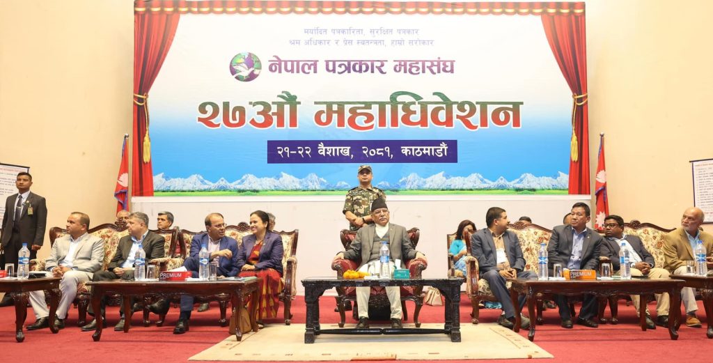 १८। नेपाल पत्रकार महासंघको २७औं महाधिवेशनको समुद्घाटन समारोहमा प्रमुख अतिथिका रुपमा उपस्थित सम्माननीय प्रधानमन्त्री पुष्पकमल दाहाल ‘प्रचण्ड’, माननीय सञ्चार तथा सूचना प्रविधिमन्त्री रेखा शर्मालगायत विभिन्न राजनीतिक दलका प्रतिनिधि, महासंघका पूर्वअध्यक्षहरु, पत्रकारसम्बद्ध विभिन्न संघसंगठनका प्रमुख तथा प्रतिनिधिहरूका साथै देशभरका सबै केन्द्रीय परिषद् सदस्यहरुलाई यो महाधिवेशन धन्यवाद ज्ञापन गर्दछ ।