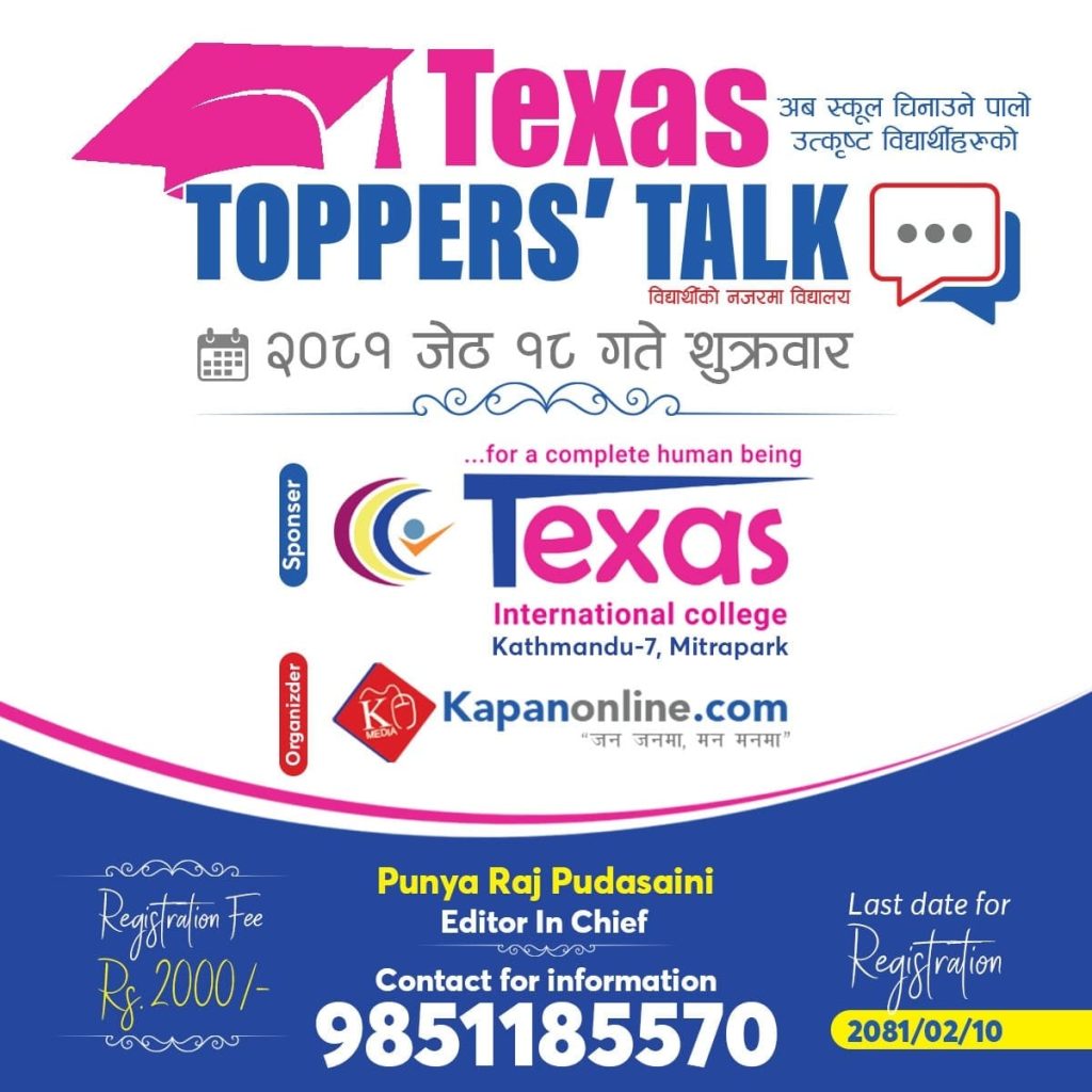 काठमाडौं । काठमाडौंको बुढानिलकण्ठ नगरपालिकामा रहेका विद्यालयहरुमा अध्यनरत उत्कृस्ट विद्यार्थीहरु मार्फत विद्यालय चिनाउनका लागि ‘टेक्सास टपर्स टक’ कार्यक्रम आयोजना हुने भएको छ।