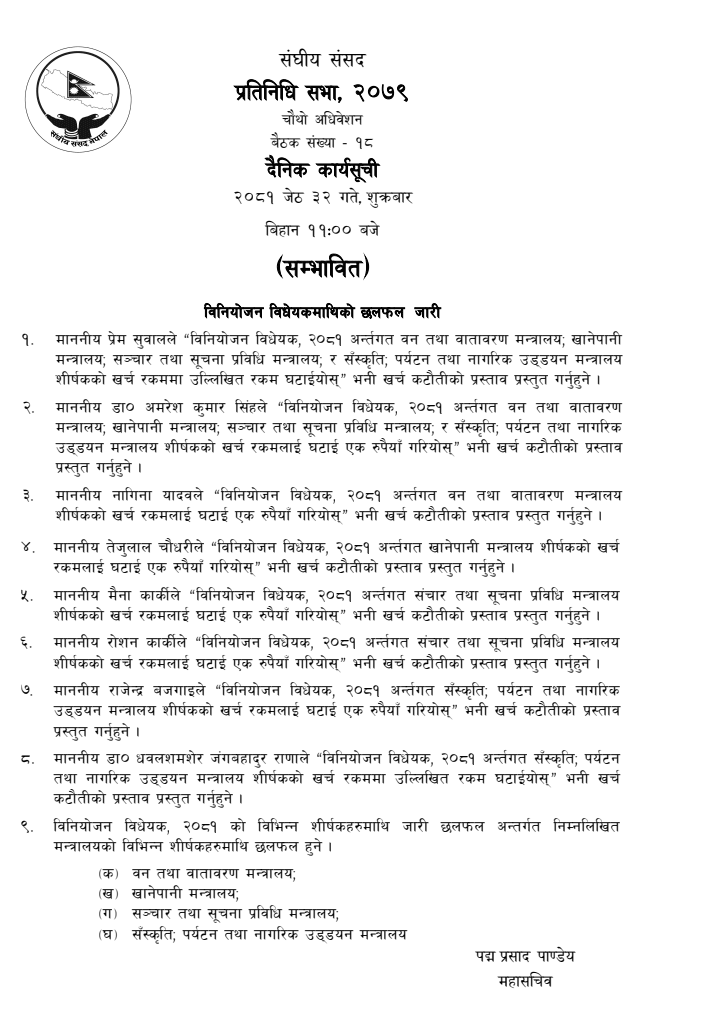 बैठकमा मन्त्रालयको खर्च घटाउन सांसदले प्रस्ताव पेश गर्ने र ती प्रस्तावलाई आजै निर्णयार्थ प्रस्तुत गर्ने कार्यसूची रहेको संसद् सचिवालयद्धारा जारी सम्भावित कार्यसूचीमा उल्लेख छ।