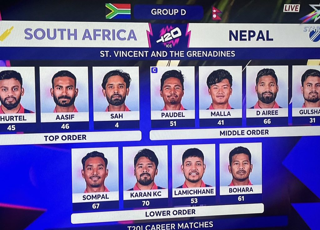 वेस्ट इन्डिजको सेन्ट भिसेन्टस्थित अरनोस भाल रंगशालामा दक्षिण अफ्रीकाविरुद्ध नेपालका कप्तान रोहित पौडेलले टस जितेर पहिला फिल्डिङ गर्नेछन्।
