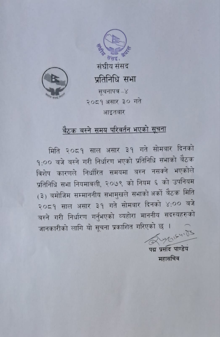 पूर्वनिर्धारित बैठक अपराह्न ४ बजेका लागि सारिएको संघीय संसद सचिवालयका महासचिव पद्म प्रसाद पाण्डेयले जानकारी दिएका छन् ।विशेष कारणले निर्धारित समयमा बैठक बस्न नसकेको सचिवालयले जनाएको छ ।